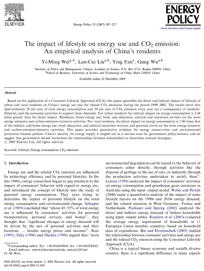 The impact of lifestyle on energy use and CO2 emission: An empirical analysis of China's residents.Y.-M Wei,L.-C. Liu,Y.Fan,G.Wu,2007.
