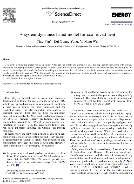 A system dynamics based model for coal investment.Y.Fan,R.-G. Yang,Y.-M Wei,2007.