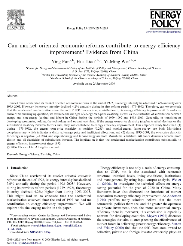 Can market oriented economic reforms contribute to energy efficiency improvement? Evidence from China.Y. Fan, H. Liao, Y.-M. Wei, 2007.
