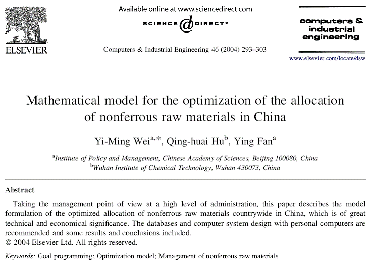Mathematical model for the optimization of the allocation of nonferrous raw materials in China.Y.-M. Wei,Q.-H. Hu,Y. Fan,2004.