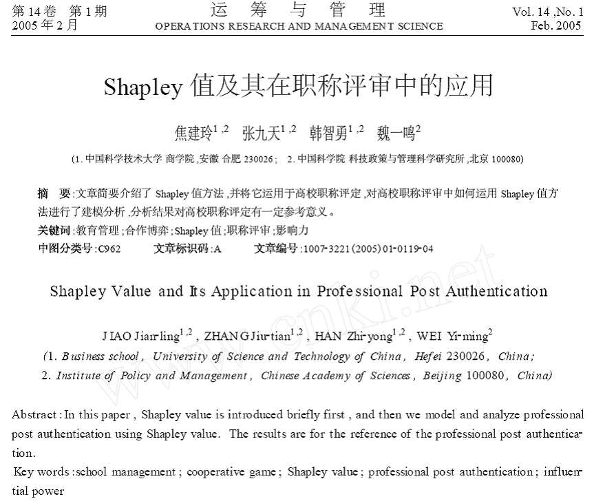 Shapley Value and Its Application in Professional Post Authentication.J.-L. Jiao,J.-T. Zhang,Z.-Y. Han,Y.-M. Wei,2005.