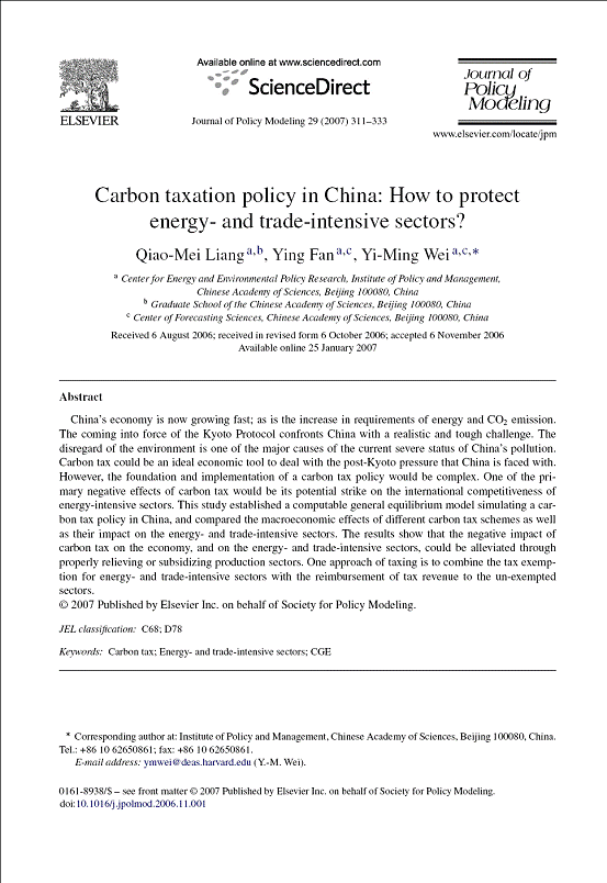 Carbon taxation policy in China: How to protect energy- and trade-intensive sectors? Q.-M Liang,Y.Fan,Y.-M Wei,2007.