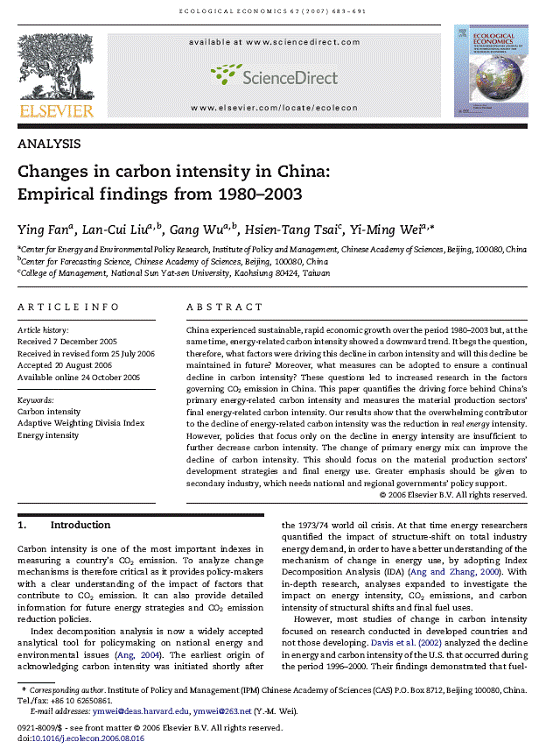 Changes in carbon intensity in China: Empirical findings from 1980–2003.Y. Fan, L. C. Liu, G. Wu, H.-T. Tsai and Y.-M. Wei,2007.