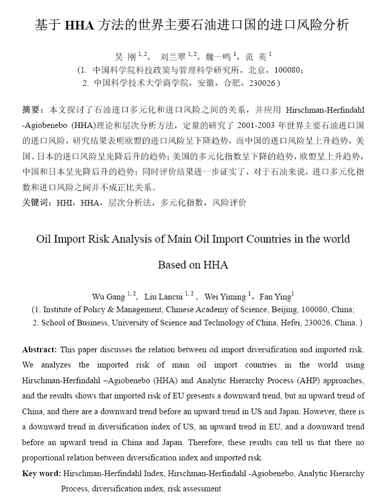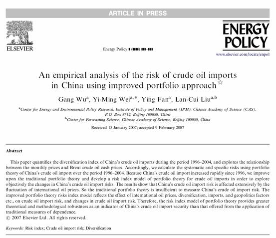 An empirical analysis of the risk of crude oil imports in China using improved portfolio approach.G.Wu,Y.-M. Wei,Y.Fan,L.-C Liu,2007.