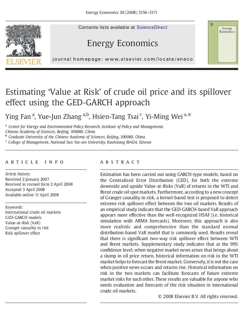 Estimating ‘Value at Risk’ of crude oil price and its spillover effect using the GED-GARCH approach, Y.Fan,Y.-J Zhang,H.-T Tsai,Y.-M. Wei,2008.