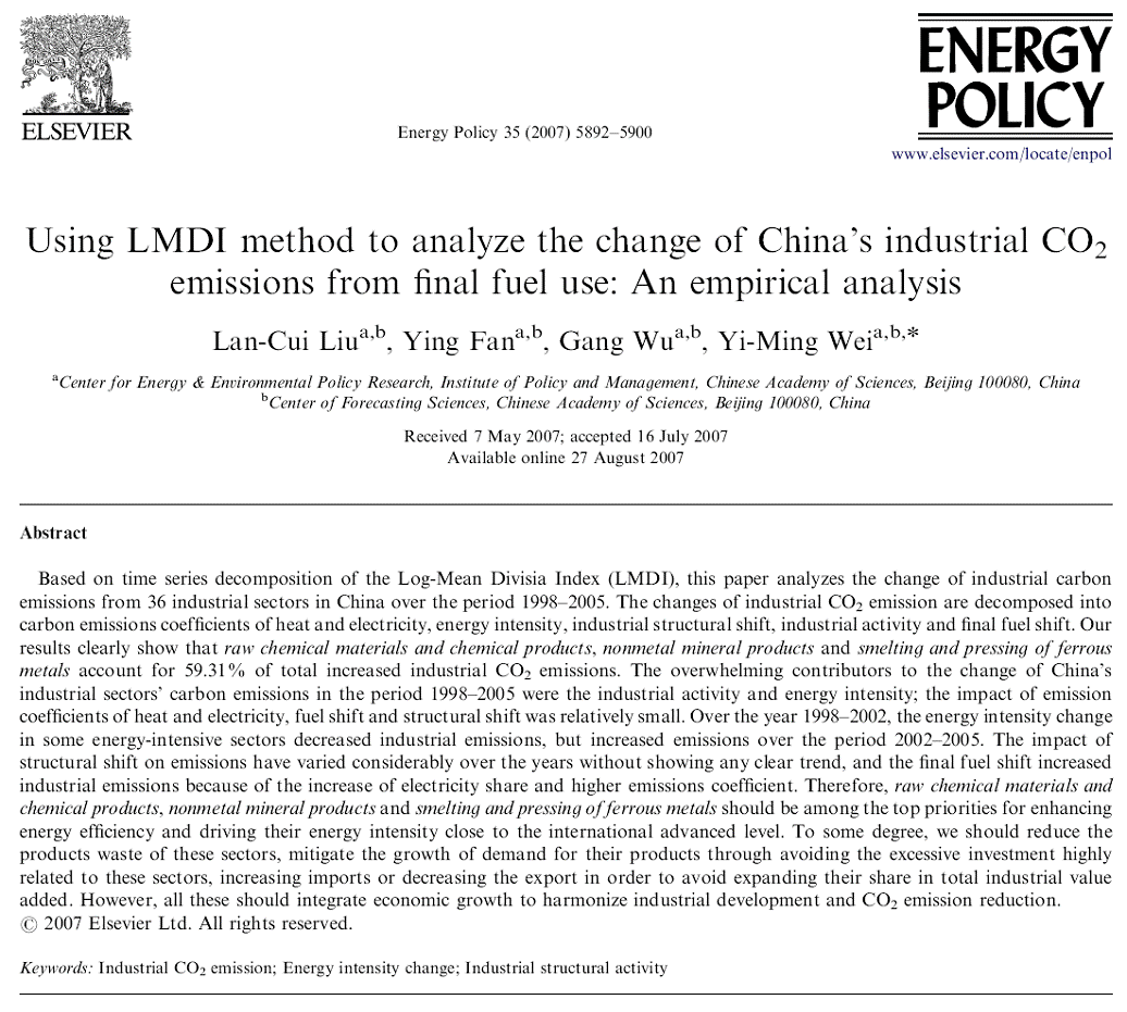 Using LMDI method to analyze the change of China’s industrial CO2 emissions from final fuel use: An empirical analysis,L.-C Liu,Y.Fan,G.Wu,Y.-M Wei,2007.