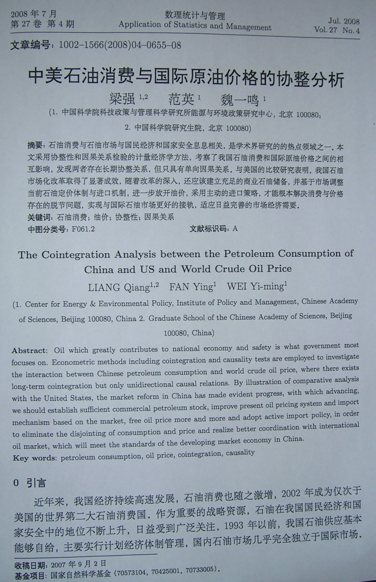 The Cointegration Analysis between the Petroleum Consumption of China and US and World Crude Oil Price, Q.Liang,Y.Fan,Y.-M Wei,2008.