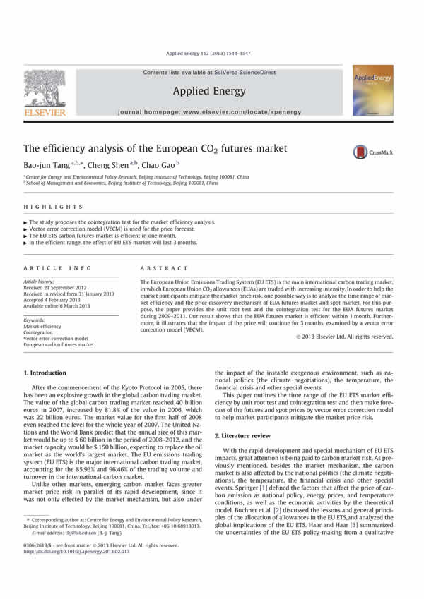 The Efficiency Analysis of the European CO2 Futures Market.B.J. Tang, C. Shen, C. Gao. 2013.