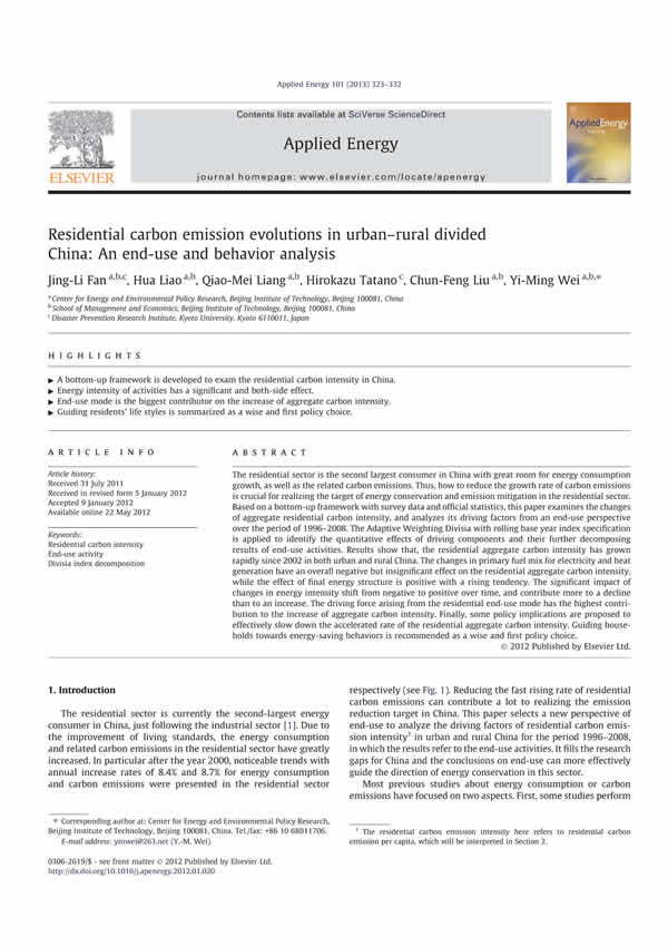 Residential carbon emission evolutions in urban–rural divided China: An end-use and behavior analysis, J.L. Fan, H. Liao, Q.M. Liang, H. Tatano, C.F. Liu, Y.-M. Wei. 2013.
