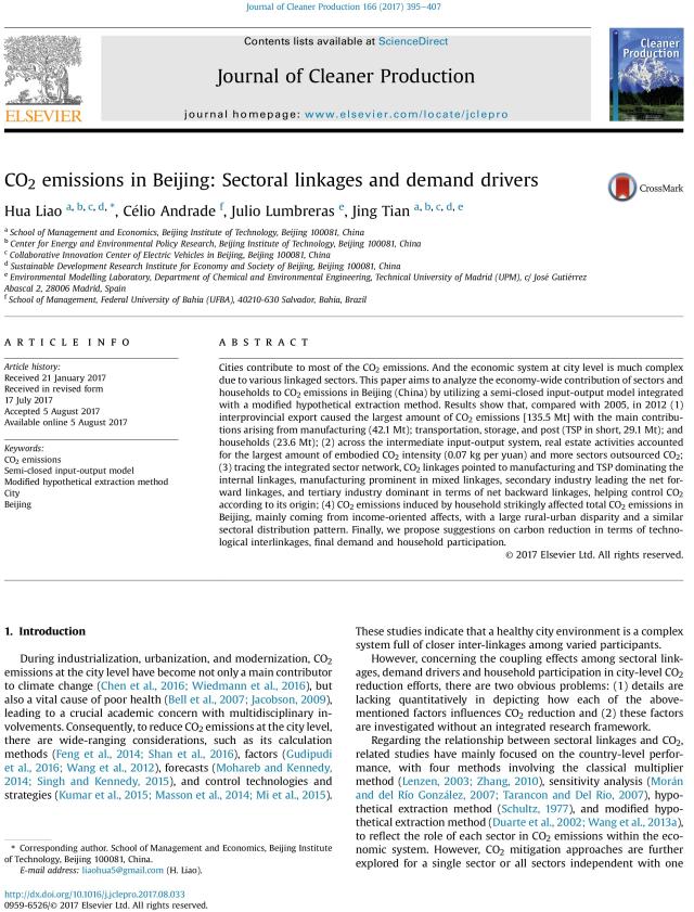 CO2 emissions in Beijing: Sectoral linkages and demand drivers. Liao H., Andrade C., Lumbreras J., Tian J., 2017