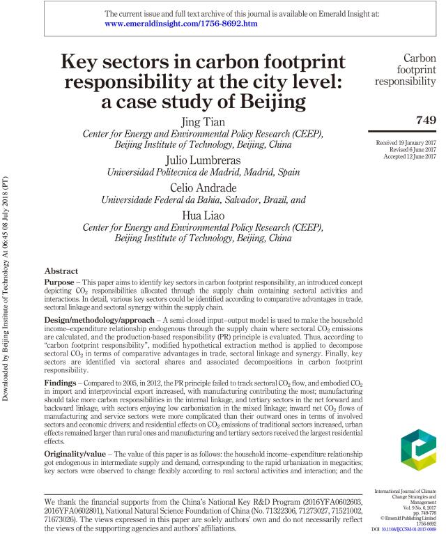 Key sectors in carbon footprint responsibility at the city level: a case study of Beijing. Tian J., Lumbreras J., Andrade C., Liao H., 2017