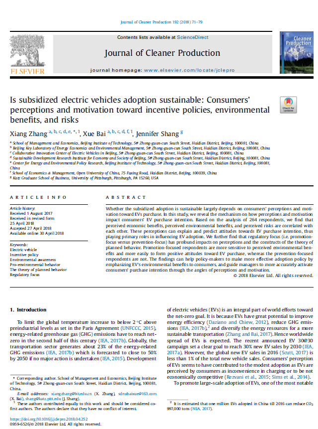 Is subsidized electric vehicles adoption sustainable: Consumers’ perceptions and motivation toward incentive policies, environmental benefits, and risks. Zhang X., Bai X., Shang J., 2018