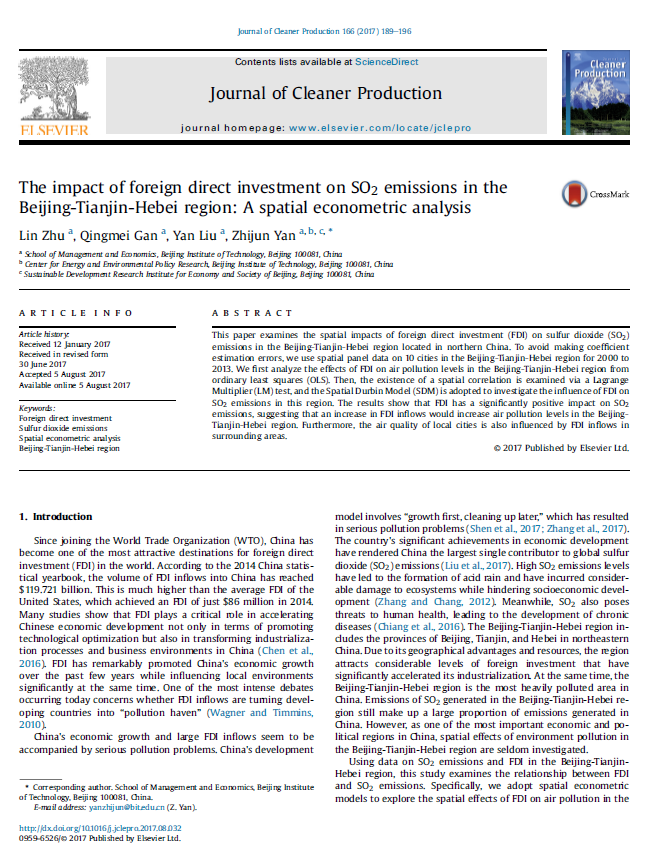 The impact of foreign direct investment on SO2 emissions in the Beijing-Tianjin-Hebei region: A spatial econometric analysis