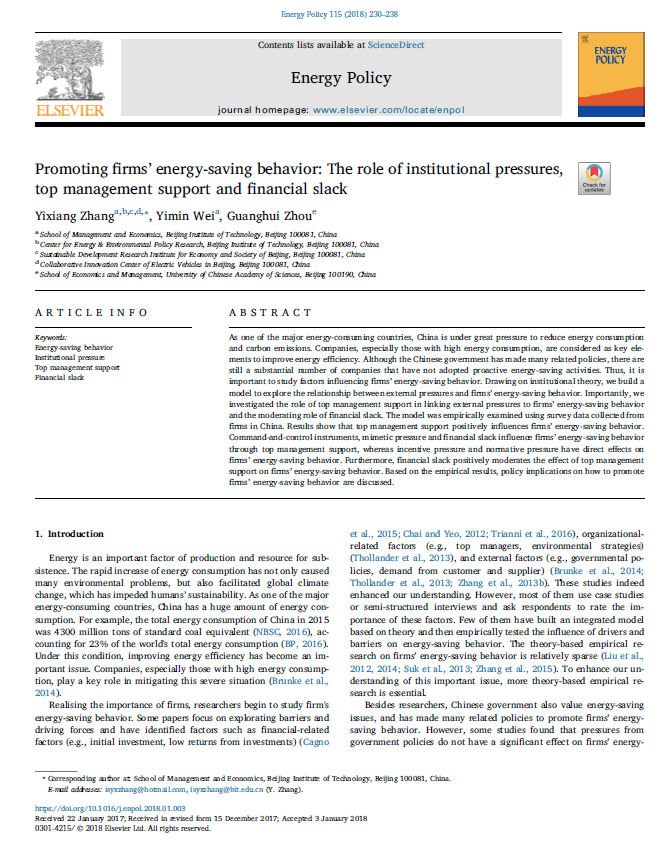 Promoting firms’ energy-saving behavior: The role of institutional pressures, top management support and financial slack. Zhang Y.X., Wei Y.M., Zhou G.H., 2018