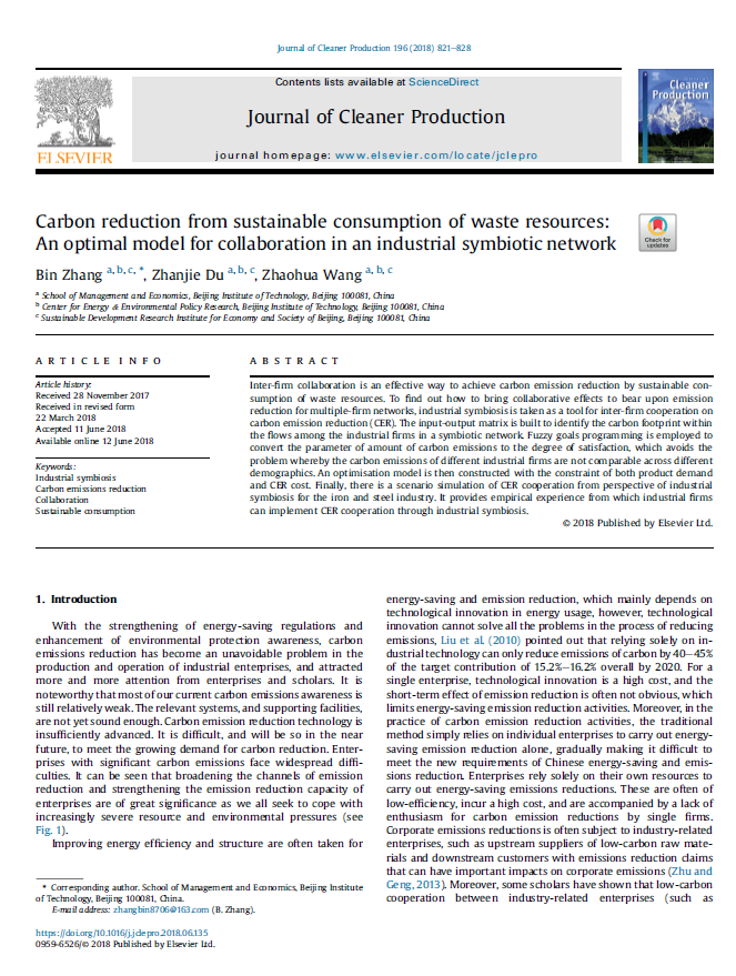 Carbon reduction from sustainable consumption of waste resources: An optimal model for collaboration in an industrial symbiotic network. Zhang B., Du Z.J., Wang Z.H., 2018
