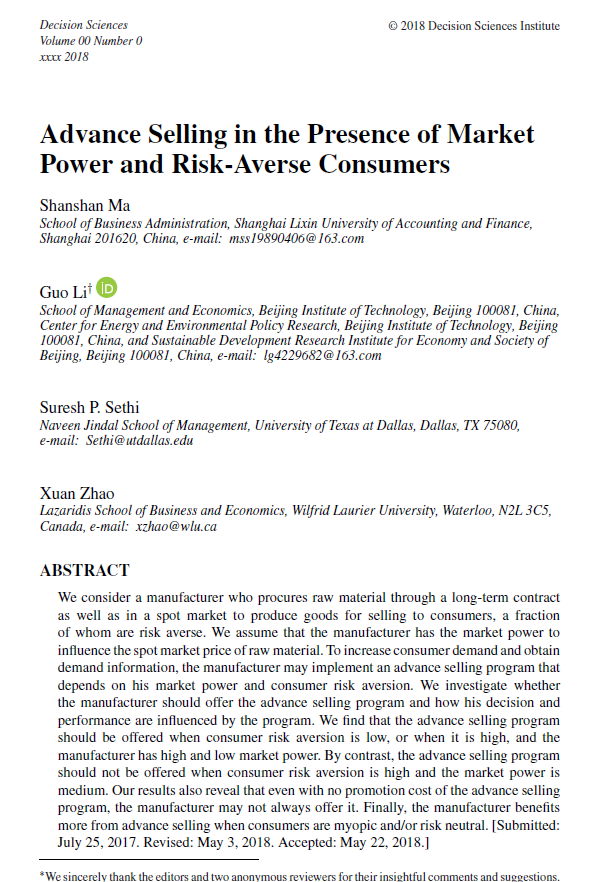 Advance Selling in the Presence of Market Power and Risk-Averse Consumers. Ma S.S., Li G., P.Sethi., et.al., 2018