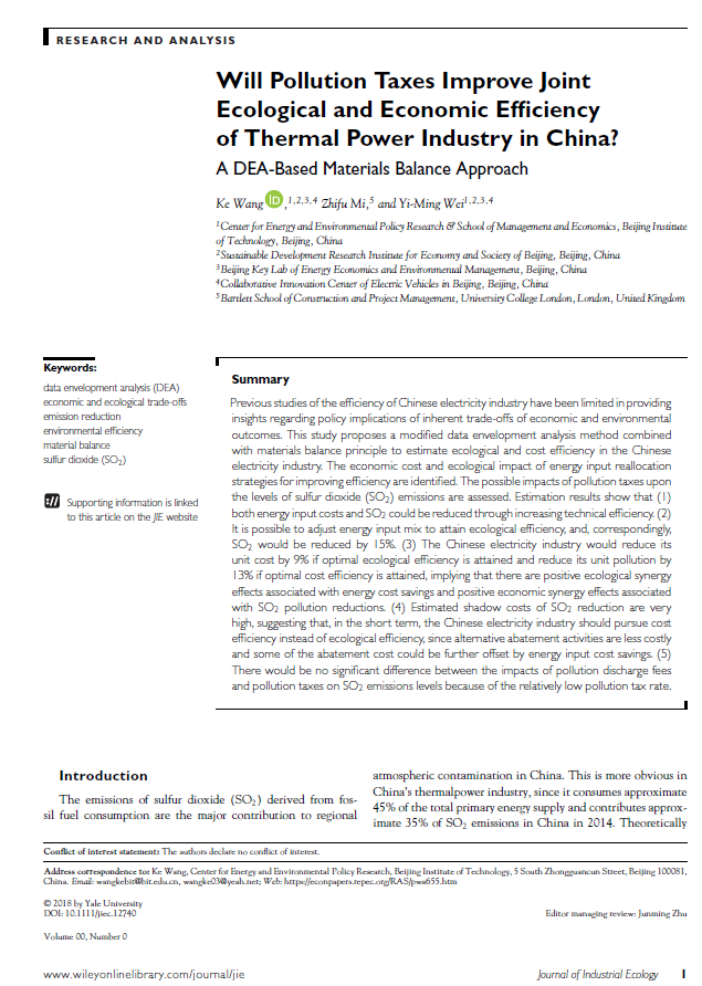 Will pollution taxes improve joint ecological and economic efficiency of thermal power industry in China? A DEA-based materials balance approach. Wang K., Mi Z.F., Wei Y.M., 2018