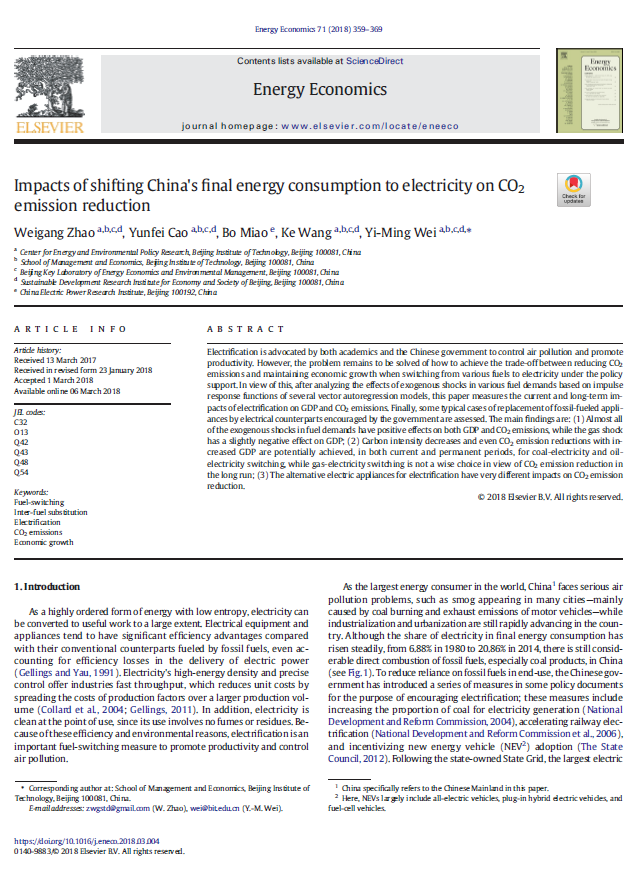 Impacts of shifting China’s final energy consumption to electricity on CO2 emission reduction. Zhao W.G., Cao Y.F., Miao B., et.al., 2018