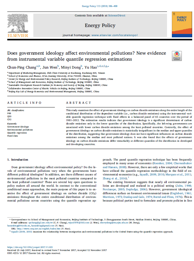 Does government ideology affect environmental pollutions? New evidence from instrumental variable quantile regression estimations