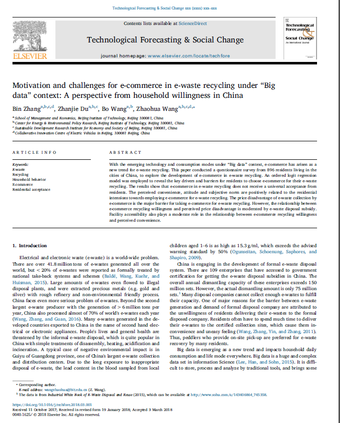 Motivation and challenges for e-commerce in e-waste recycling under“ Big data ”context: A perspective from household willingness in China. Zhang B., Du Z.J., Wang B., Wang Z.H., 2018