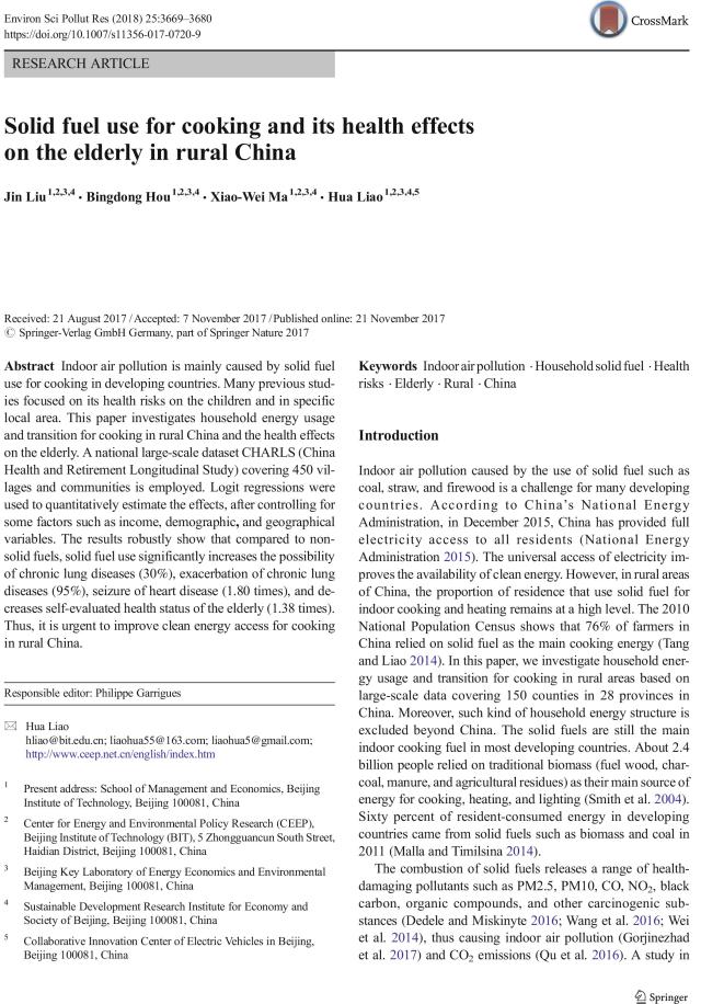 Solid fuel use for cooking and its health effects on the elderly in rural China. Liu J., Hou B.D., Ma X.W., Liao H., 2018