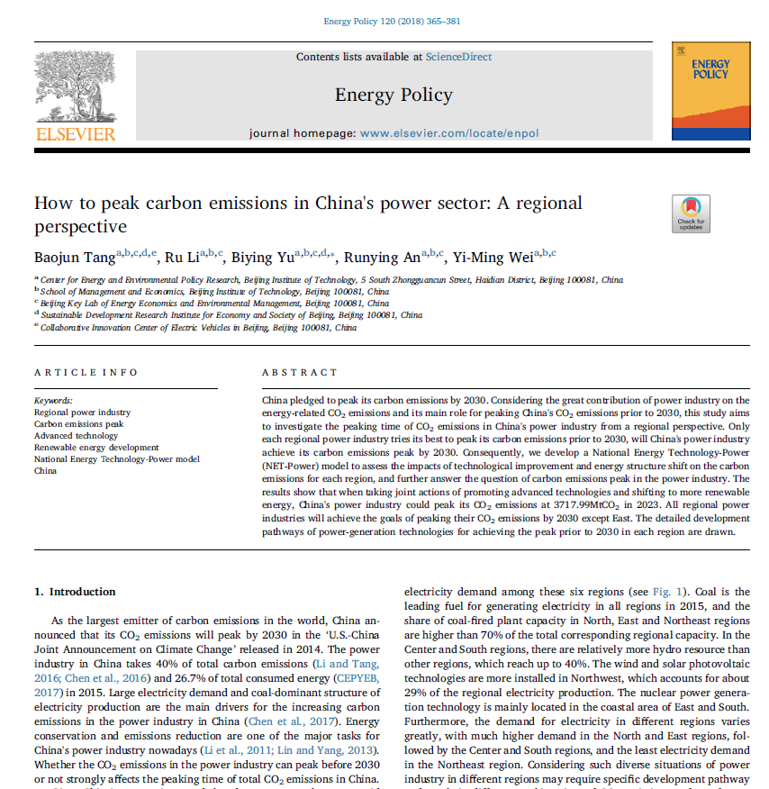 How to peak carbon emissions in China's power sector: A regional perspective. Tang B.J., Li R., Yu B.Y., et.al, 2018