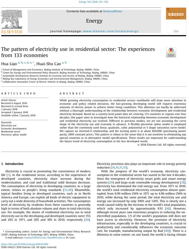 The pattern of electricity use in residential sector: The experiences from 133 economies. Liao H., Cao H.S.,2018