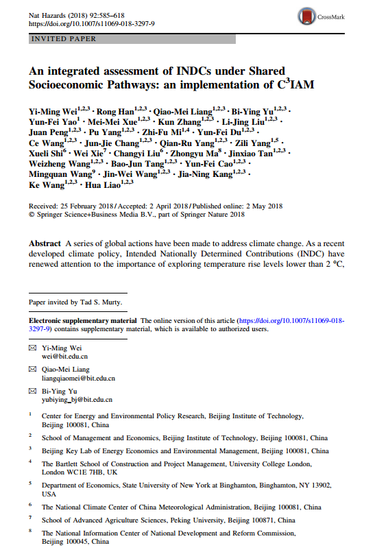An integrated assessment of INDCs under Shared Socioeconomic Pathways: an implementation of C3IAM. Wei Y.M., Han R., Liang Q.M., et.al, 2018