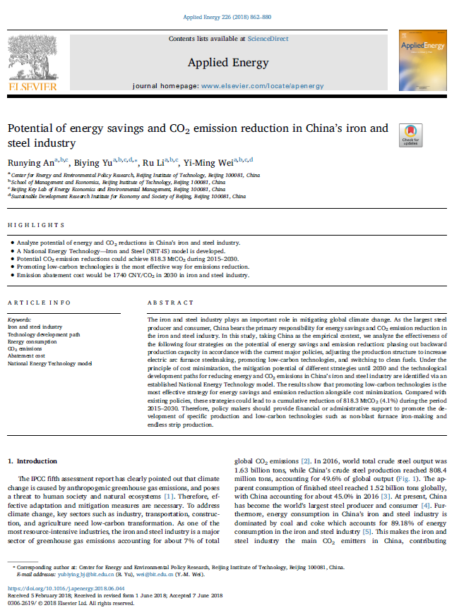Potential of energy savings and CO2 emission reduction in China’s iron and steel industry. An R.Y., Yu B.Y., Li R., Wei Y.M., 2018