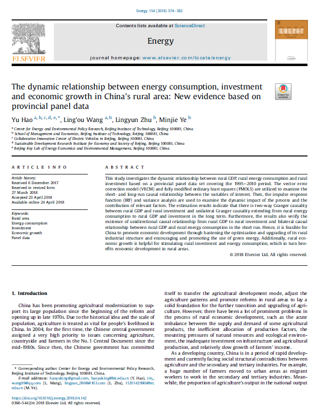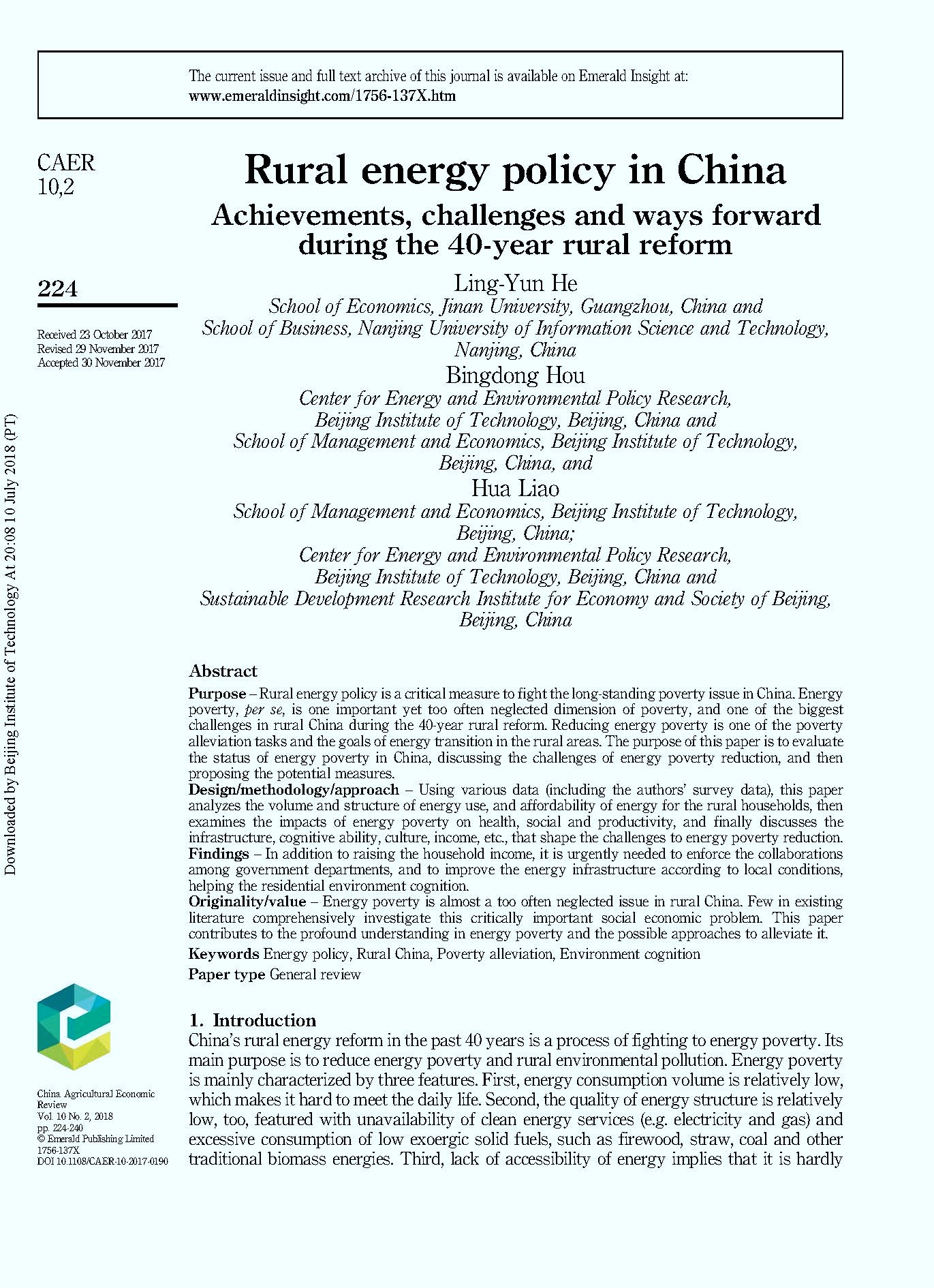 Rural energy policy in China: Achievements, challenges and ways forward during the 40-year rural reform. He L.Y., Hou B.D., Liao H., 2018