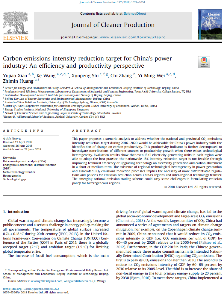 Carbon emissions intensity reduction target for China’s power industry: An efficiency and productivity perspective. Xian Y.J., Wang K., Shi X.P., et.al , 2018