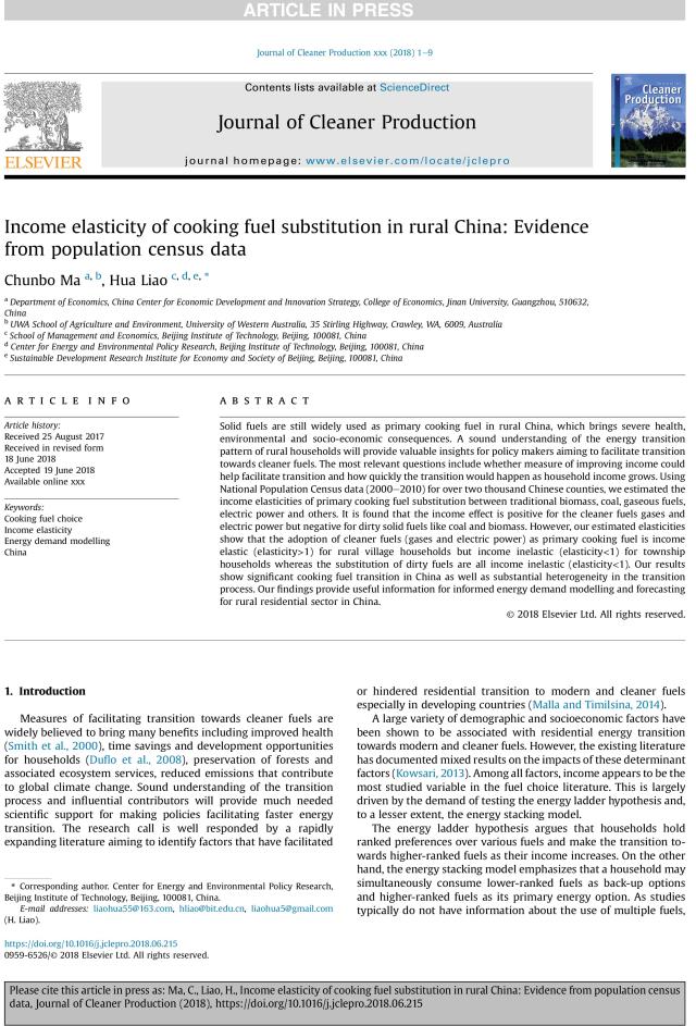 Income elasticity of cooking fuel substitution in rural China: Evidence from population census data. Ma C.B., Liao H., 2018