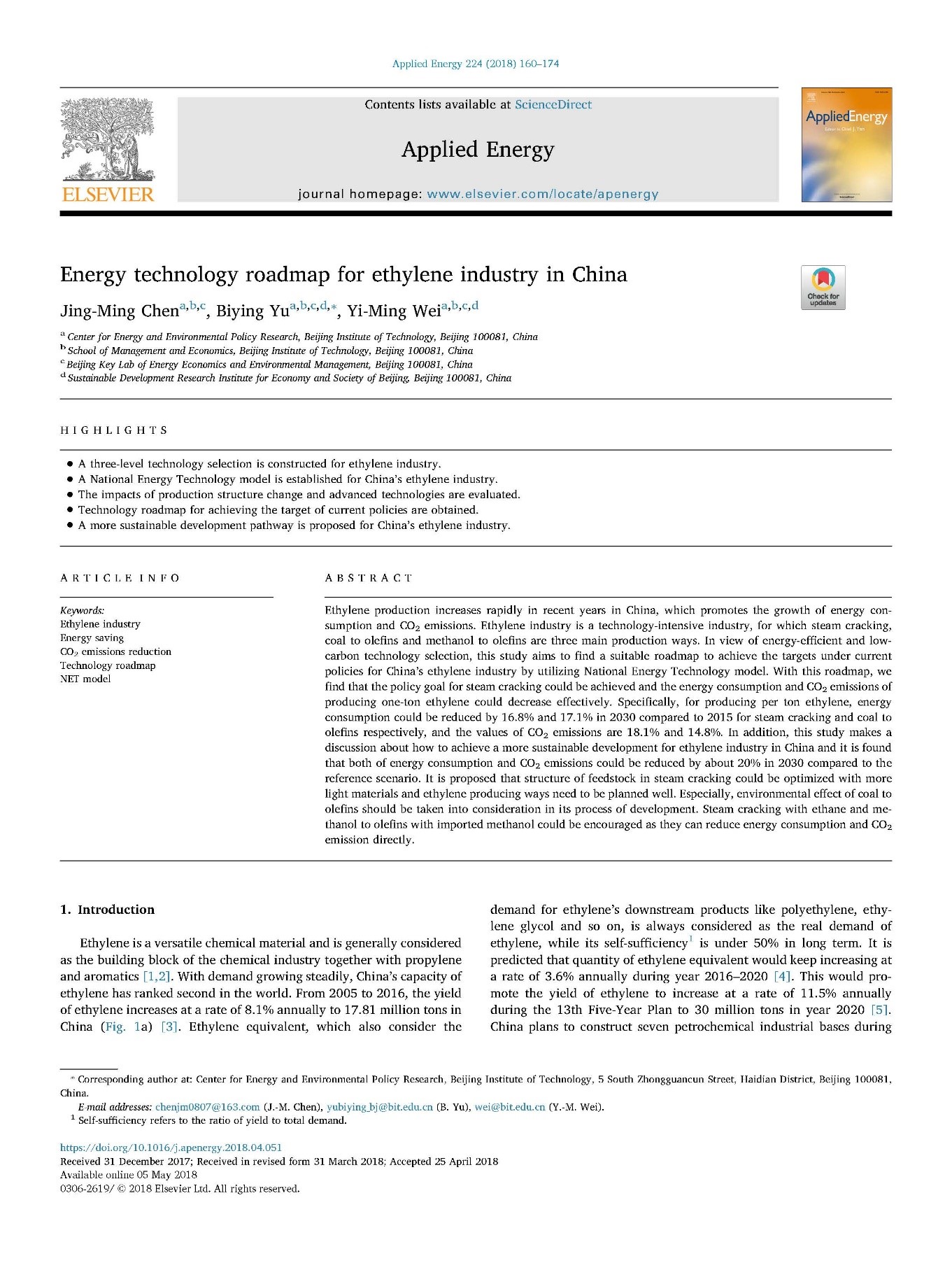 Energy technology roadmap for ethylene industry in China. Chen J.M., Yu B.Y., Wei Y.M., 2018