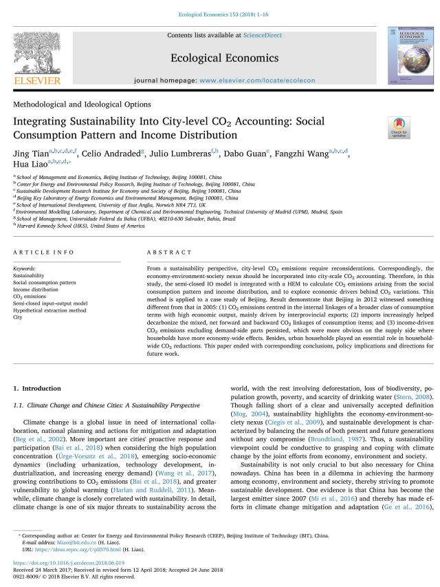 Integrating Sustainability Into City-level CO2 Accounting: Social Consumption Pattern and Income Distribution. Tian J., Andraded C., Lumberas J.,et.al., 2018