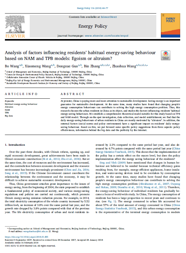 Analysis of factors influencing residents' habitual energy-saving behaviour based on NAM and TPBmodels: Egoism or altruism?