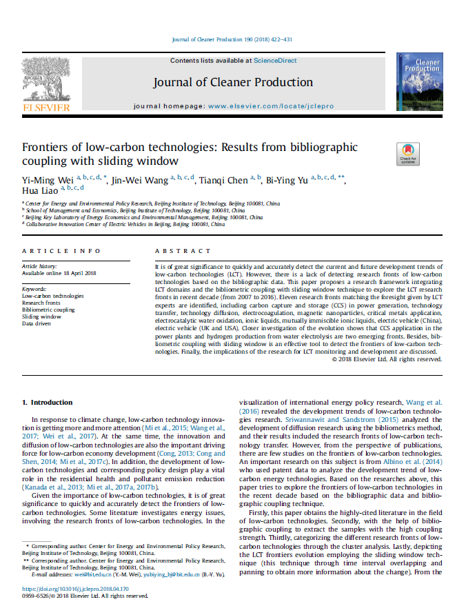 Frontiers of low-carbon technologies: Results from bibliographic coupling with sliding window. Wei Y.M., Wang J.W., Chen T.Q., et.al, 2018
