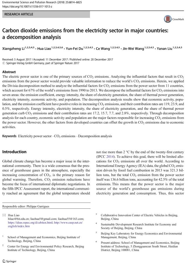 Carbon dioxide emissions from the electricity sector in major countries: a decomposition analysis. Li X.Z., Liao H., Du Y.F., et.al., 2018