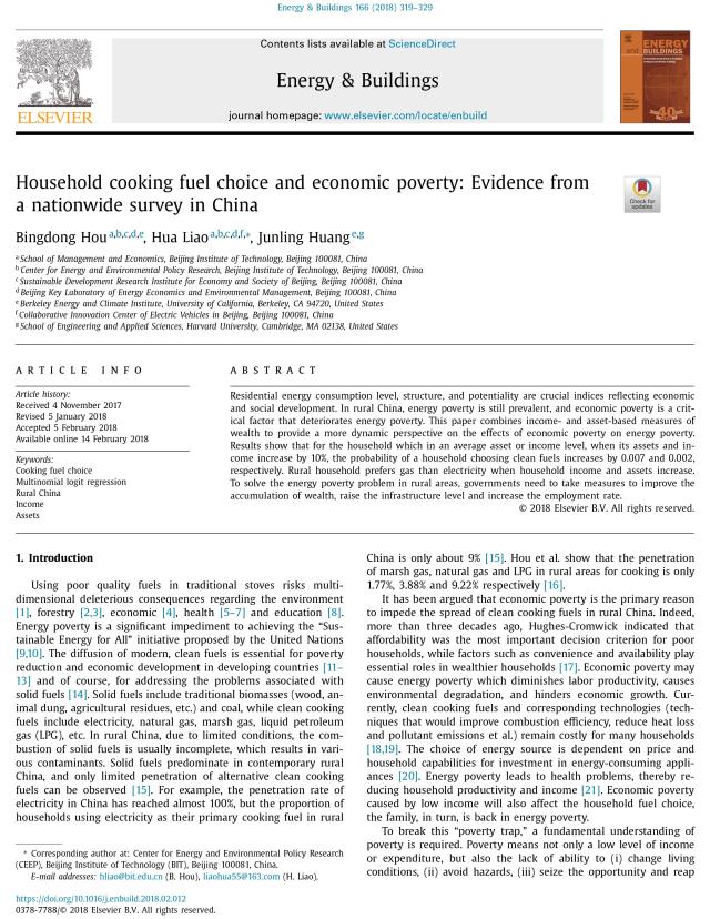 Household cooking fuel choice and economic poverty: Evidence from a nationwide survey in China. Hou B.D., Liao H., Huang J.L., 2018