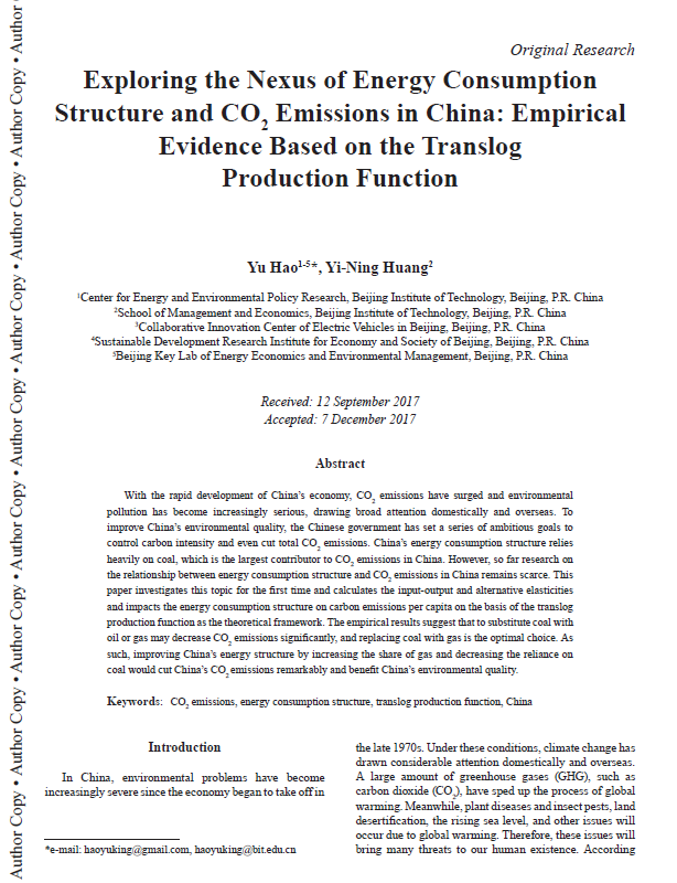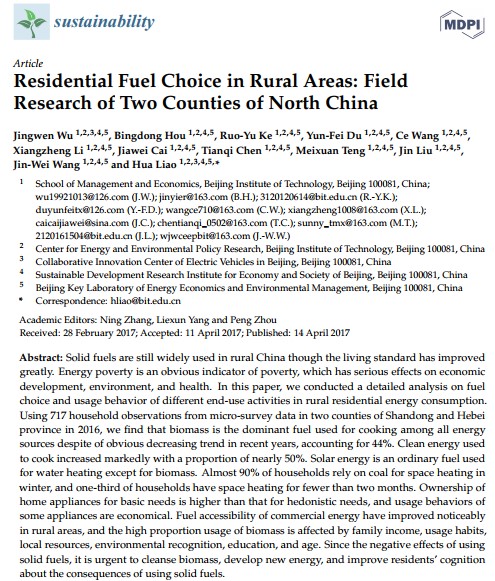 Residential Fuel Choice in Rural Areas: Field Research of Two Counties of North China. Wu, J.; Hou, B.; Ke, R.-Y.; Du, Y.-F.; Wang, C.; Li, X.; Cai, J.; Chen, T.; Teng, M.; Liu, J.; Wang, J.-W.; Liao, H*. 2017