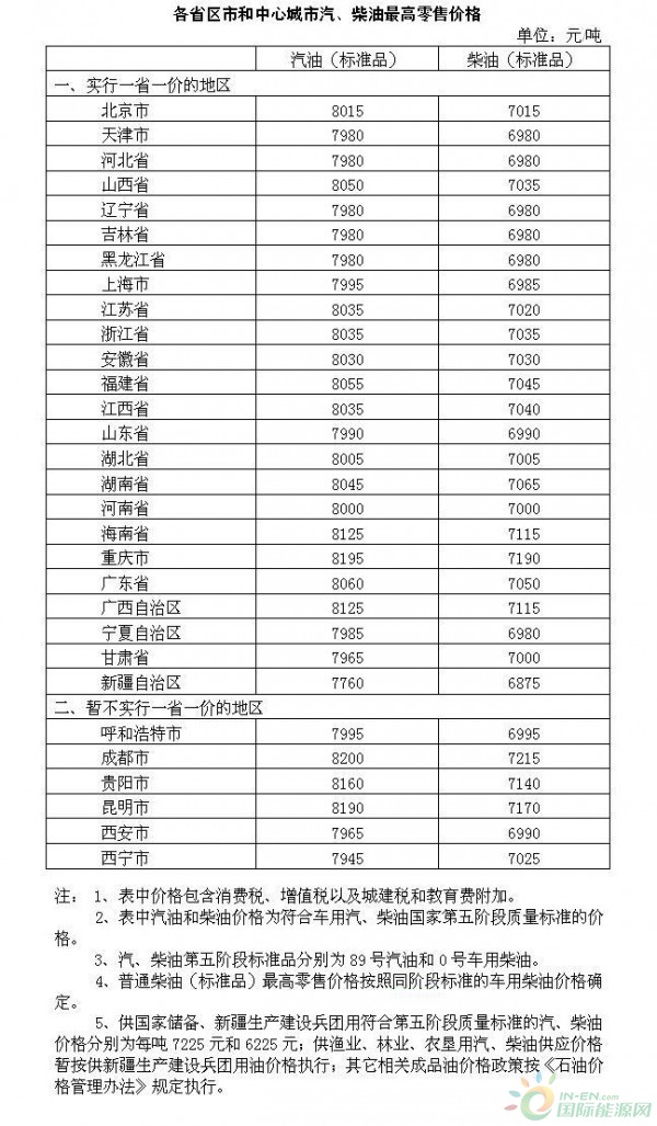 各省区市和中心城市汽、柴油最高零售价格(图片来源:国际能源网)