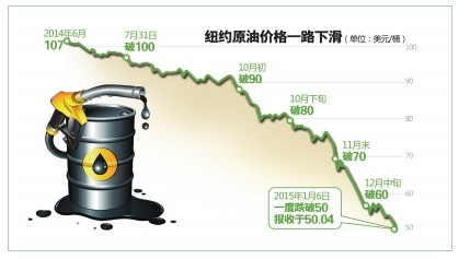 美国时间5日早间,纽约原油期货价格下跌1.97美元,暴跌3.7%,至每桶50.71美元。随后油价一直盘旋在每桶50美元边缘,并在上午尾盘一举跌破每桶50美元重要关口,至每桶49.95美元,刷新2009年4月以来最低价格,随后油价反弹至50美元上方,报收于50.04美元/桶。较2014年6月份107美元/桶的本轮高点,半年的时间里其走势呈现断崖式下跌,价格已经腰斩。同日,伦敦布伦特原油期货价格下跌2.23美元,暴跌4%,一举跌破每桶55美元重要关口,跌至每桶54.19美元,盘中触及每桶53.73美元低点,跌至2009年年中以来最低点。