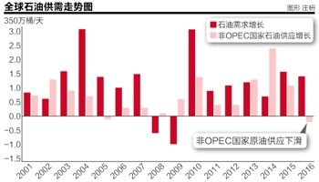 目前,油价已从去年6月每桶115美元的高点,跌至每桶50美元以下。这轮暴跌令各石油出口国的预算一片混乱,引发了金融市场的震荡,并迫使全球最大能源企业取消了投资计划。非欧佩克(OPEC)国家的产量增幅已低于2014年的高点,并导致全球供应量每天减少60万桶,减至今年7月的9660万桶。然而尽管如此,今年迄今这些国家产量的增长幅度仍比2014年的平均水平高。
