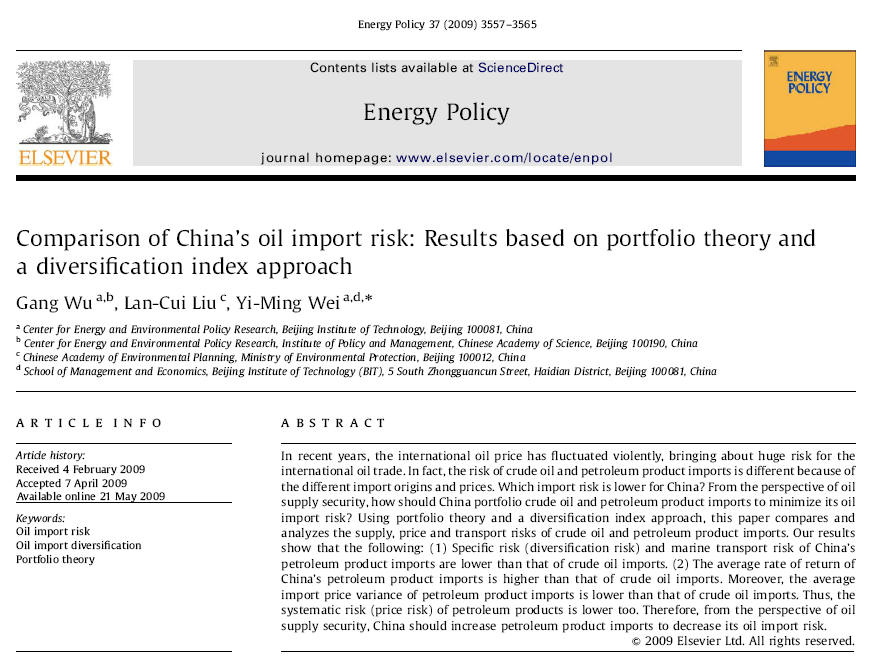 Comparison of China's oil import risk: Results based on portfolio theory and a diversification index approach, G.Wu,L.-C Liu,Y.-M Wei,2009.