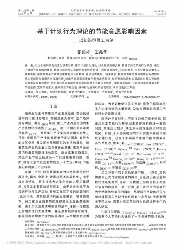 基于计划行为理论的节能意愿影响因素--以知识型员工为例. 张毅祥, 王兆华. 2013.