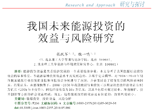 Study on the Benefits and Risks of China's Future Energy Investment, Y.-J Zhang,Y.-M Wei,2010.
