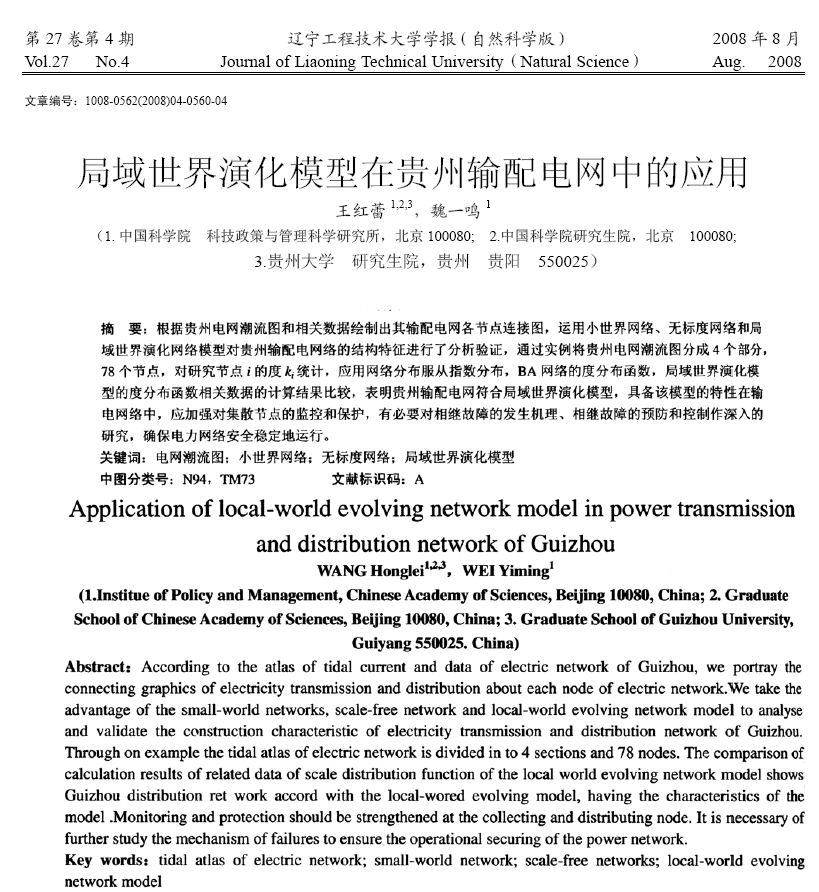 Application of local-world evolving network model in power transmissionand distribution network of Guizhou.H.-L Wang,Y.-M Wei,2008.