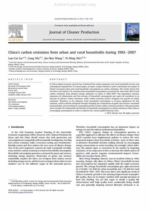 China's carbon emissions from urban and rural households during 1992-2007, L.-C Liu,G.Wu,J.-N Wang,Y.-M Wei,2011.