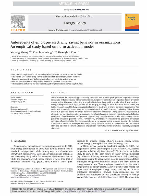 Antecedents of employee electricity saving behavior in organizations: An empirical study based on norm activation model. Y. Zhang, Z. Wang, G. Zhou. 2013.
