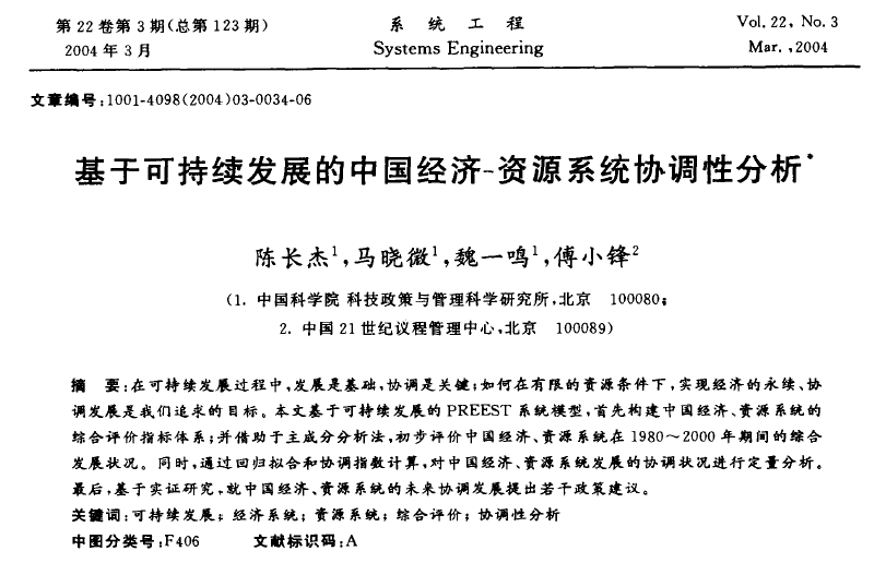 A Harmony Analysis on System of Economy and Resource Based on Sustainable Development in China.C.-J. Chen,X.-W. Ma,Y.-M. Wei,X.-F. Fu,2004.