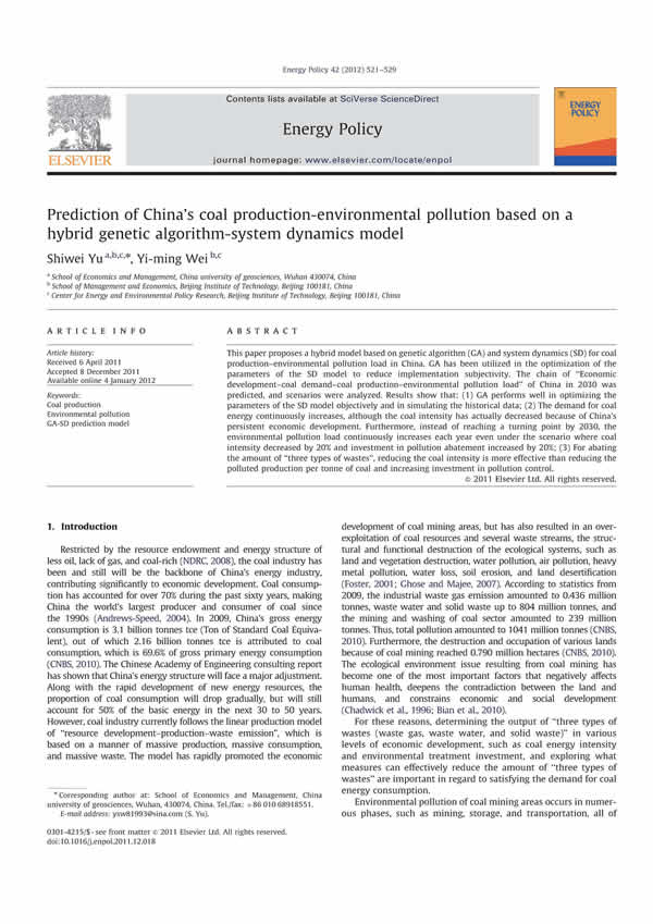 Prediction of China's Coal Production-Environmental Pollution Based on a Hybrid GA-SD Model.S.W. Yu, Y.-M. Wei. 2012.